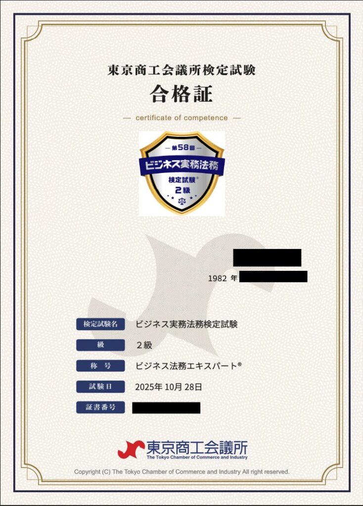 2025年10月28日、わたくし鯉次郎は第58回ビジネス実務法務検定2級(ビジ法2級)に合格しました。