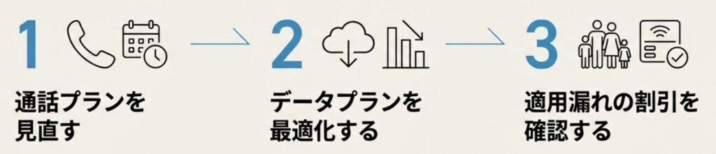 - まずは現在の請求明細を確認し、不要オプションの解約とデータ容量の見直しから始めることが節約の第一歩